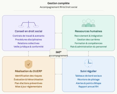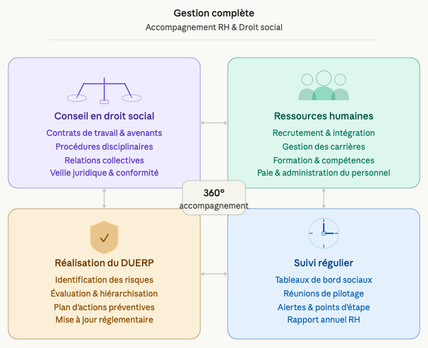 Gestion complète : conseil en droit social, ressources humaines, réalisation DUERP, suivi régulier